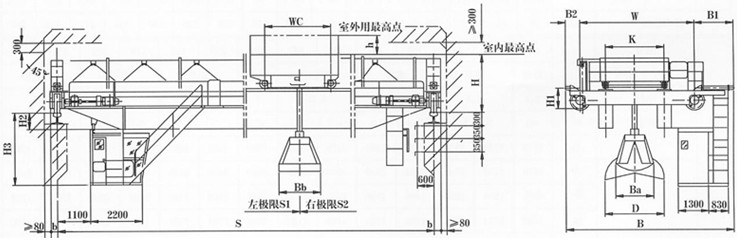 工作級別A6級,駕駛室操作。抓斗開閉方向垂直主梁,進入操縱室的走臺門向位置為端面。